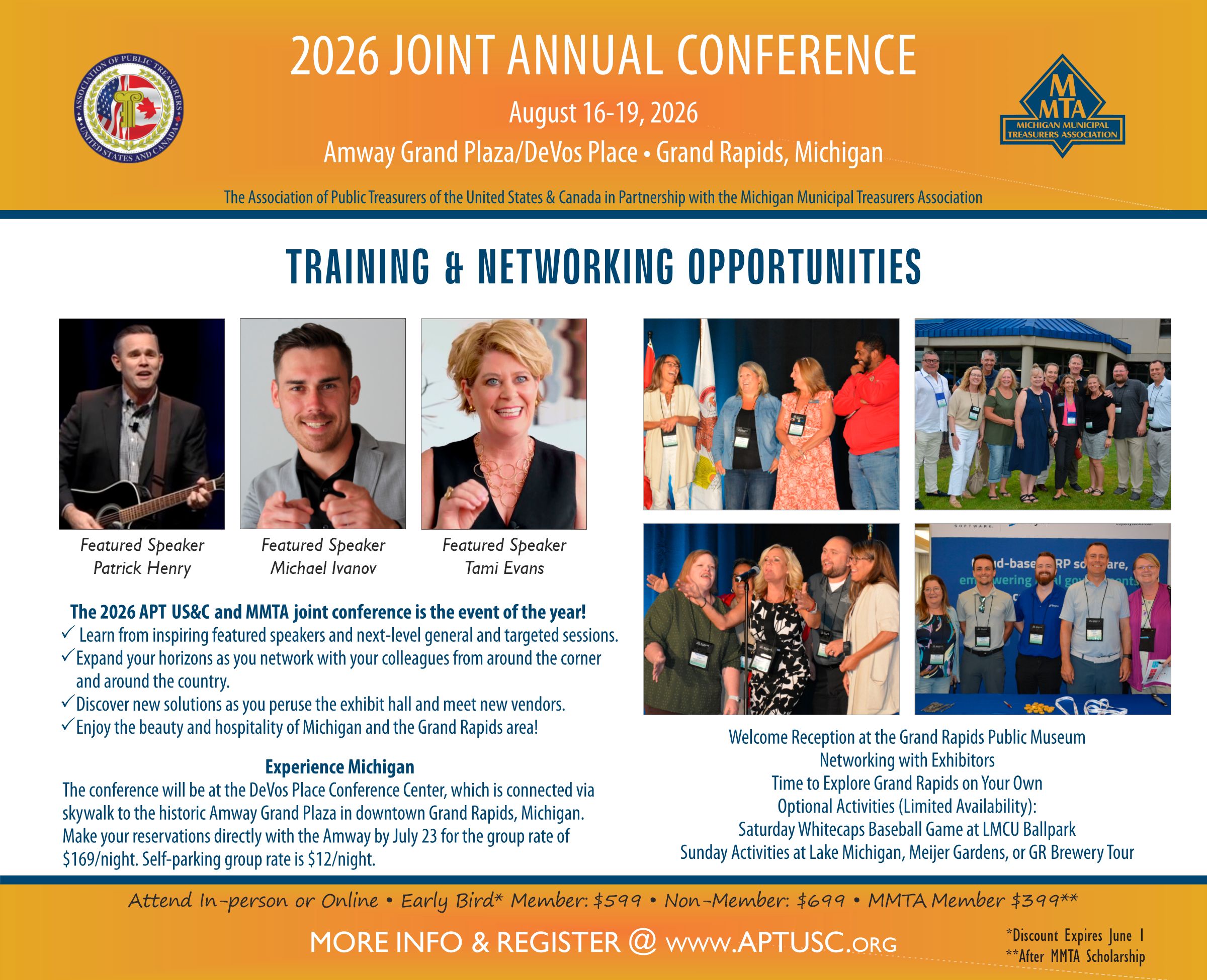 We are thrilled to partner with the Michigan Municipal Treasurers Association (MMTA) for a joint annual conference this year. Thank you to the MMTA Board of Directors for their support and for the Michigan members who are already working with the APT planning committee to bring all attendees amazing  topics, speakers, and activities.