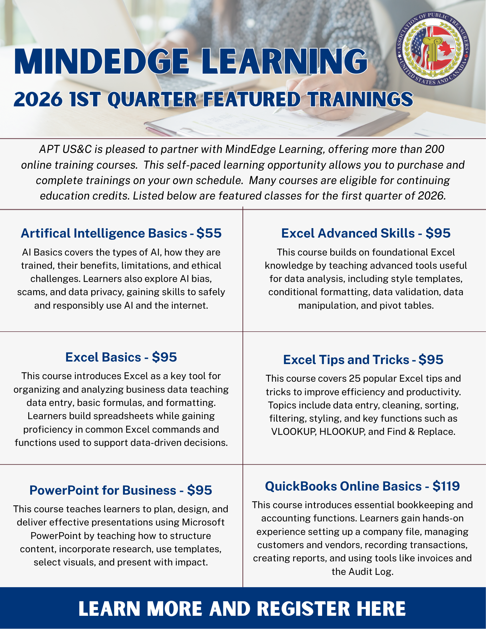 Registration is now open for the 2026 Annual Conference. Plan to join us in Grand Rapids, Michigan August 16-19! For more information and to register, click here. 2026 TrainingsAPT US&C is pleased to announce the release of our 2026 Training Calendar, offering a comprehensive lineup of professional development opportunities designed to support growth, compliance, and operational excellence. Self-Paced TrainingAPT US&C offers a wide variety of online training programs through our partner, Mind Edge. Learn more about Microsoft Excel training or browse all the training that is available. |