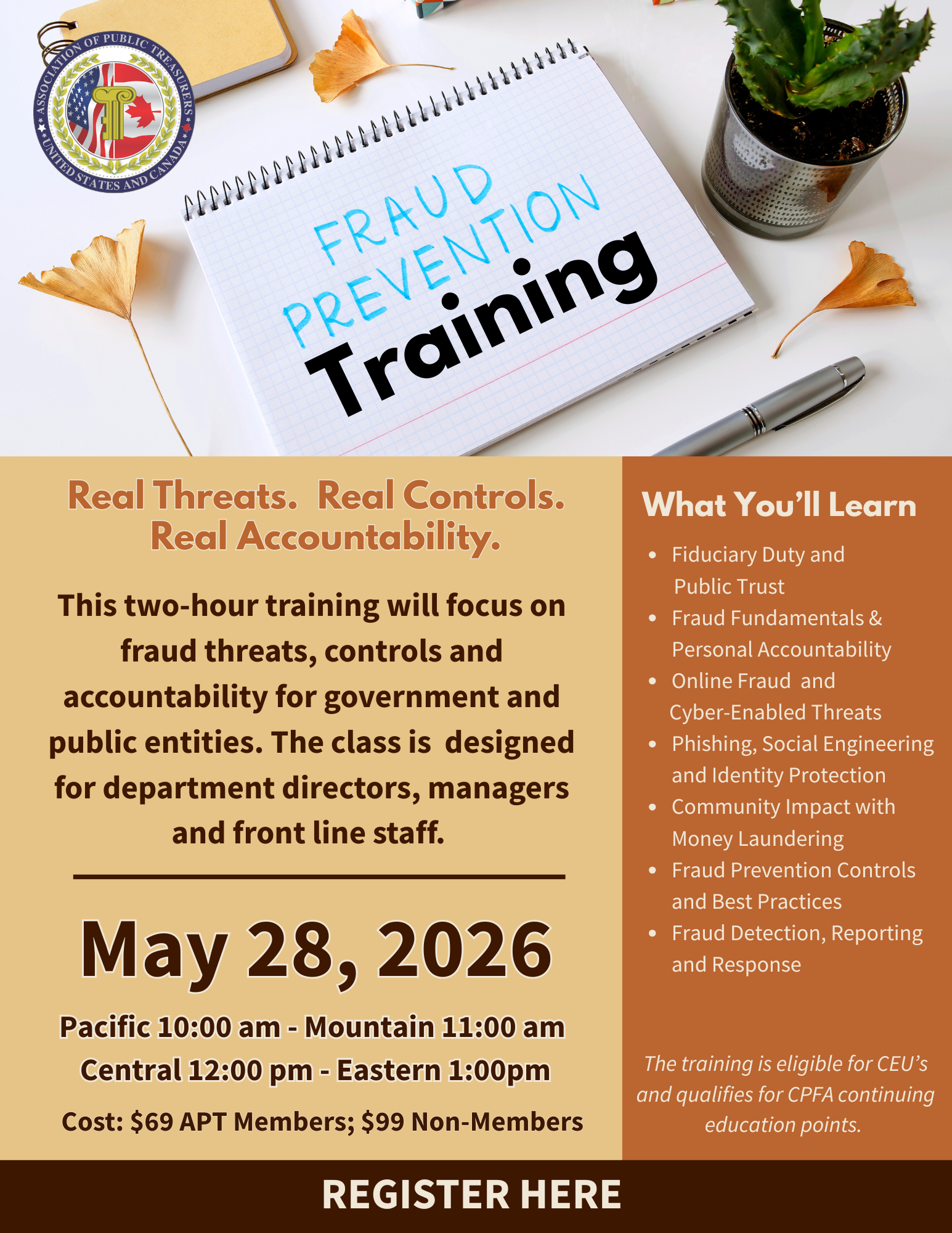 This Fraud Prevention Training will be held Thursday, May 28, 2026 and focus on fraud threats, controls and accountability for government and public entities. Designed for department directors, managers and front line staff, attendees will learn:
